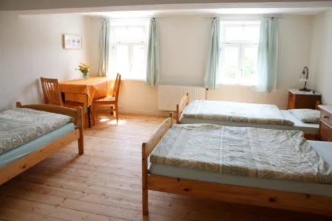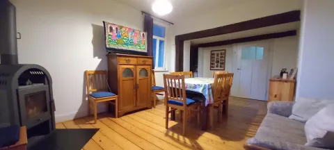 Auf der mittleren Etage befindet sich auch eine Küche mit dem Gemeinschaftsraum (mit Kaminofen) und ein großes Badezimmer (mit 2 Duschen, 2 WCs und mehreren Waschgelegenheiten sowie einem kleinen Badezimmer mit Sitzbadewanne, Toilette und Waschbecken).