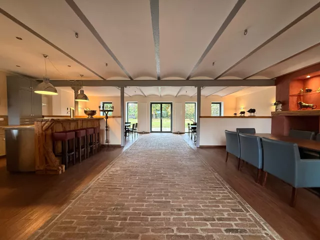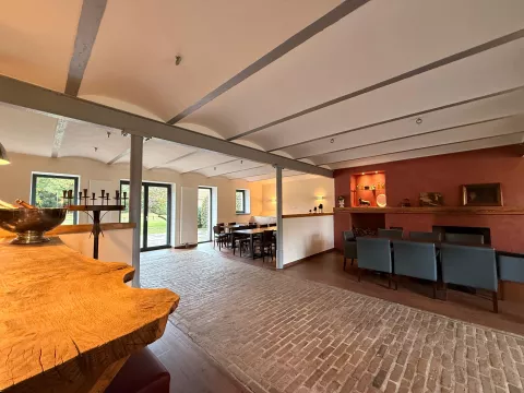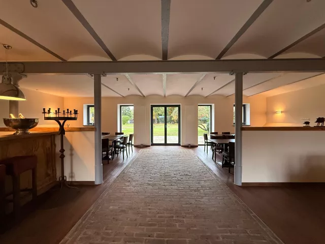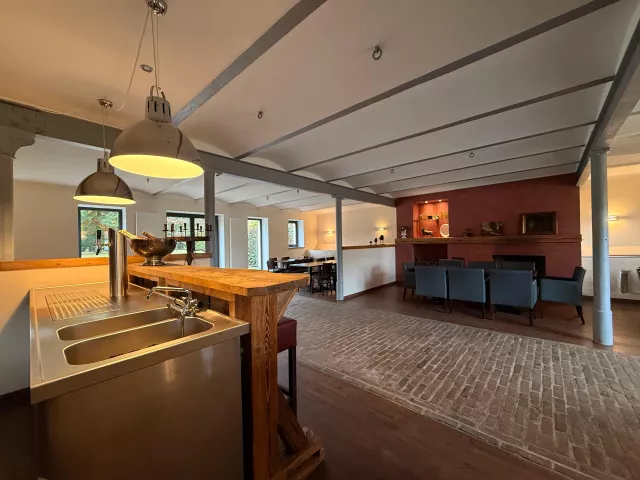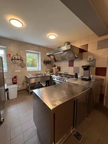 Da bereits in der Planung des Objekts verschiedene Nutzungsmöglichkeiten einflossen, wurde zusätzlich im EG ein geräumiger Gast-/Gemeinschaftsraum mit Kamin angelegt. Dieser Raum ist ca. 160m2 groß und hat eine angrenzende, voll ausgestattete Gastroküche mit den notwendigen Wirtschaftsräumen und Sanitäreinrichtungen/WC für Damen und Herren. Je eine Terrasse nach Osten und Westen erschließen den Gemeinschaftsraum zum Außenbereich.