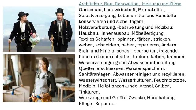 Holzverarbeitung, -bearbeitung und Holzbau: Hausbau, Innenausbau, Möbelfertigung.