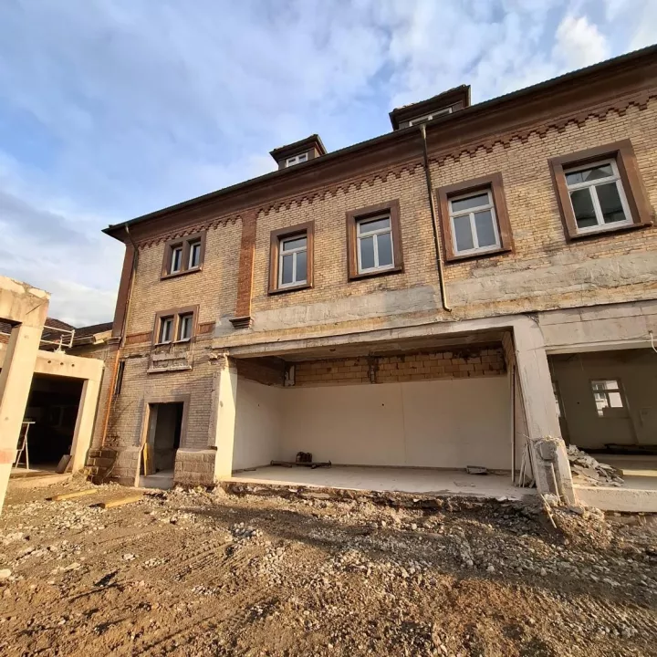 - Das historische Gebäude und der ehemalige Supermarkt werden sich im Zuge der Umbaumaßnahmen in hochwertigen Wohnraum verwandeln. Dabei ist geplant die asphaltierten Parkplätze des Grundstückes zu entsiegeln, die Stellflächen stark zu reduzieren und größtenteils in Garten umzuwandeln. Dafür streben wir einen Wandel von individueller zu kollektiver Mobilität an. Car- und Bikesharing betrachten wir dabei als einen wesentlichen Bestandteil.