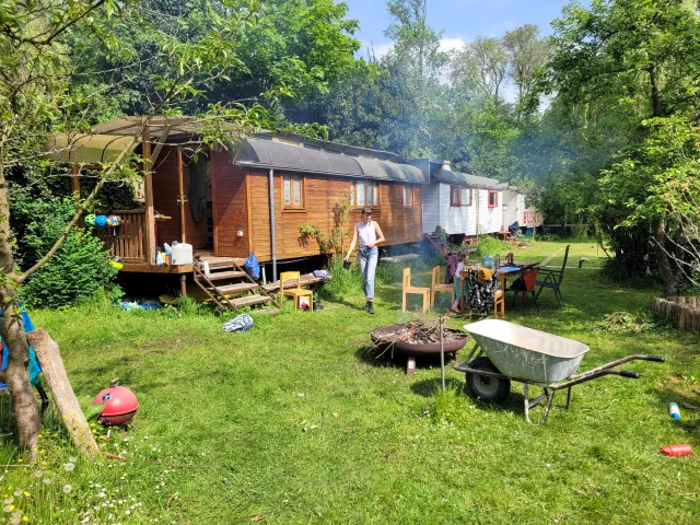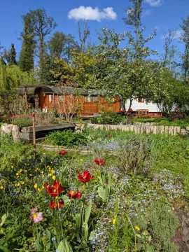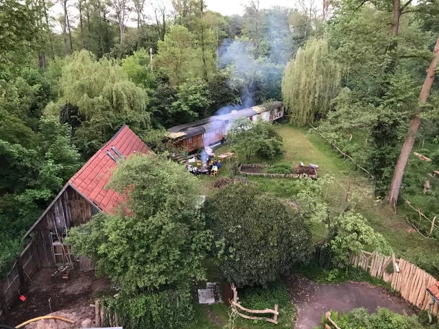 Neben dem Haupthaus gibt es zwei Nebengebäude mit einer Werkstatt und Sommerküche und drei Zirkuswägen, die einen Wasser- und Stromanschluss haben, jedoch nicht dauerhaft bewohnbar sind. Im ca. 1.500 m2 großen Garten gibt es bereits diverse Bäume, Sträucher und Kräuter, ein Gemüseanbau wäre in Hochbeeten denkbar. Das Grundstück grenzt an einer Seite an ein Nachbarhaus und ist ansonsten umgeben vom anliegenden Kleinen Spreewaldpark.