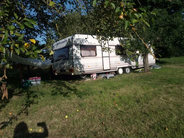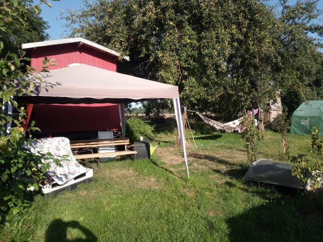 bzw in Ergänzung zum nahe gelegenen Demeterhof, solidarische Landwirtschaft auf eigenem Boden, wobei der Anbau zur autarken Versorgung zunächst ausreichen sollte! Ausbau der vorhandenen Scheune zum Wohnraum und oder Gemeinschaftsraum möglich, was primär fokusiert werden kann, jedoch mindestens zwei Jahre Bauzeit mit viel Eigenleistungen und ca. 30.000 Euro Material erfordert (eigene Erfahrung). Hierbei würde nachhaltig mit Holz und Lehm sowie Papierdämmung und gebrauchten und aufgearbeiteten Bauteilen (Fenster, Türen, Treppen) gebaut werden. Wohn- und Wagenstellplätze zwischen den Obstbäumen vorhanden, eigener Brunnen (Trinkwasserversorgung hierüber durch Aufbereitungsanlage und weitere Verteilung im Bau).