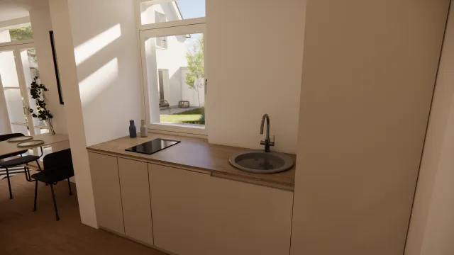 Der multifunktionale Eingangsbereich dient als gemeinschaftlicher Treffpunkt und schirmt den Innenhof ab und kann als Wohnküche für alle genutzt werden. In den Sommermonaten lässt er sich öffnen und verbindet Innen- und Außenraum.