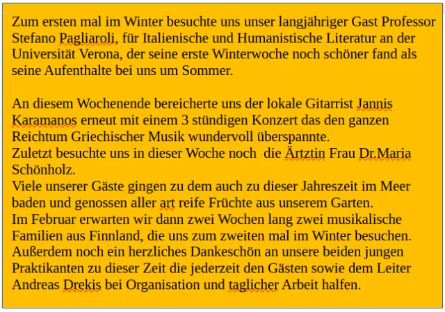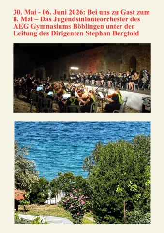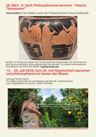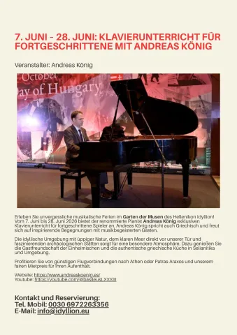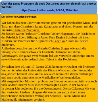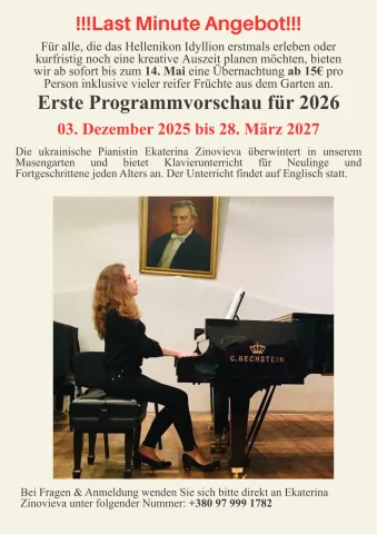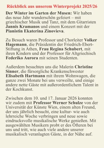 • Das Jahr lassen wir am 31. Dezember 2025 in einem hauseigenen Klavierkonzert von Ekaterina Zinovieva mit Werken von Beethoven, Chopin, Scriabin u.a. ausklingen. Anschließend wird zu einem geselligen Griechischen Abend eingeladen.