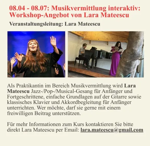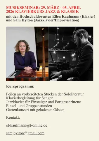 • Vom 10. bis 17. Januar 2026 ist die Sopransängerin Xenia Galanova zu Gast und gibt Gesangsunterricht für Sangfreudige verschiedenen Niveaus.