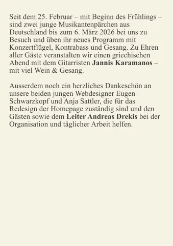 • Unser Weihnachtsfest am 25. Dezember 2025 wird der griechische Sänger und Gitarrist Jannis Karamanos mit seinem großen Repertoire voller griechischer Leidenschaft gepaart mit kulinarischen Spezialitäten erfüllen.