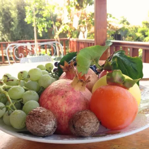 Der Garten trägt zu jeder Jahreszeit Früchte: Im Winter Orangen, Mandarinen, Kumquat, Grapefruits, Zitronen, Avocados und Oliven; im Frühling und Sommer Mispeln sowie verschiedene Trauben; im Herbst Feigen und Kakis. All diese Schätze dürfen von den Gästen direkt vom Baum genossen werden. Ab Mitte März beginnt die Blütezeit, der ganze Garten duftet, und ab Ende April sind die ersten Früchte reif.