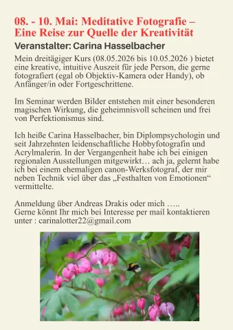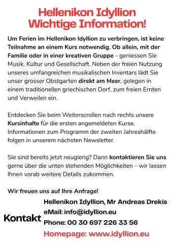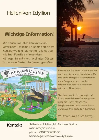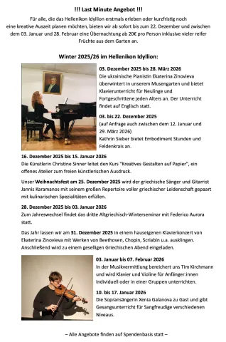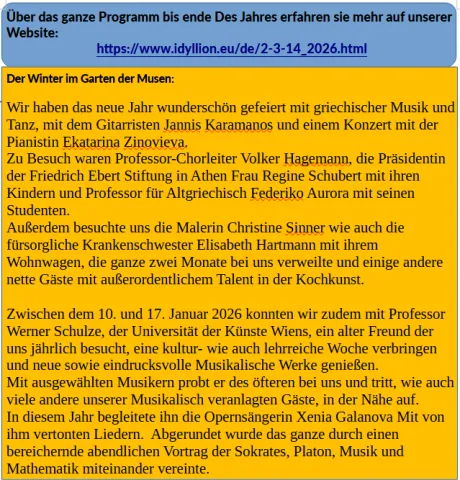 Winter 2025/26 im Hellenikon Idyllion - auch in den kommenden Monaten freuen wir uns auf inspirierende Gäste, Workshops und Begegnungen, ganz im Sinne des schöpferischen Austauschs und der gelebten Gemeinschaft: