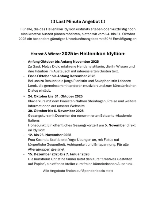 Für alle, die das Hellenikon Idyllion erstmals erleben oder kurzfristig noch eine kreative Auszeit planen möchten, bieten wir vom 24. bis 31. Oktober 2025 ein besonders günstiges Unterkunftsangebot mit 50 % Ermäßigung an!