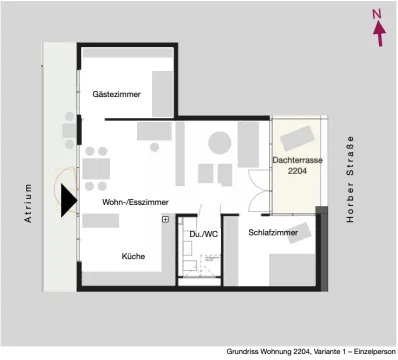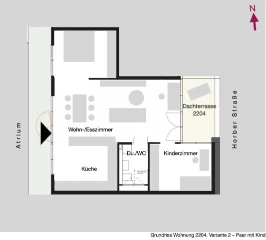 Der Blick aus Wohnung 2204 ins Atrium ist heute ausdrücklich erwünscht – deshalb öffnen wir die Glasfront vollständig: Das dargestellte Bild der Eingangszone zeigt deutlich, dass der Essplatz flexibel angeordnet werden kann – entweder in Verlängerung der Küche für einen großzügigen Wohnraum mit extra Arbeitsbereich (Grundrissvariante 1) oder in den Wohnraum integriert als kommunikatives Zentrum im Familienalltag (Grundrissvariante 2).