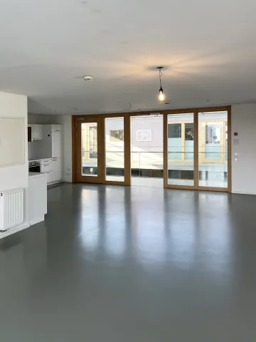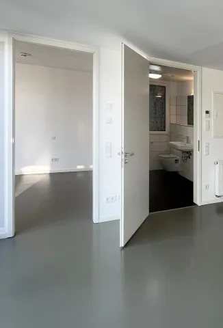 Der durchgehende Epoxidharzboden verbindet alle Räume fugenlos und ist besonders pflegeleicht. Auf Wunsch kann jederzeit ein zusätzlicher Belag aufgebracht werden.