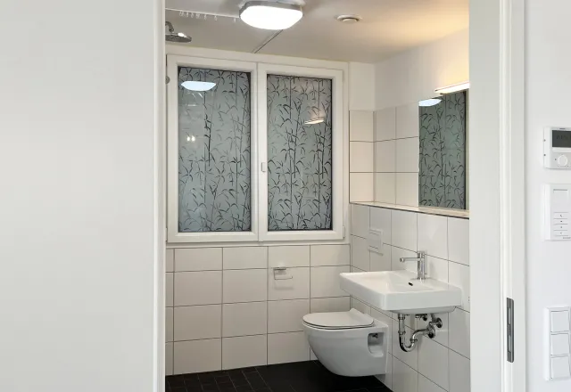 Gegen den in den Verkehrsspitzen leicht erhöhten Straßenlärm schützt die verglaste Terrasse zur Horber Straße zuverlässig. Dank der hochwertigen Dreifachverglasung der Außenfenster bleibt das Wohnumfeld angenehm ruhig.